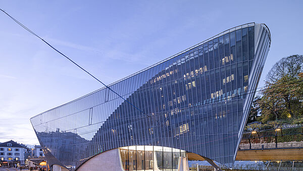 Die skulpturale Glasfassade des «Haus zum Falken» setzt am Bahnhof…