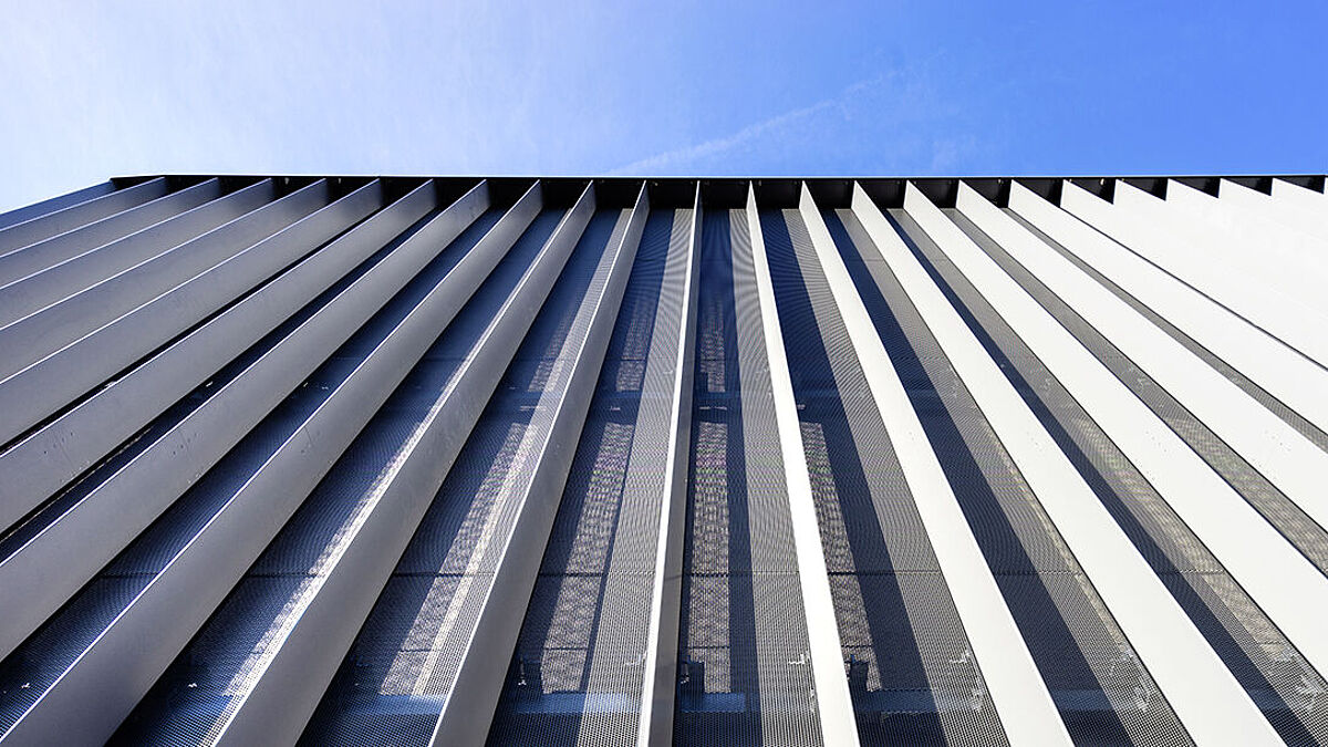 Der Vorteil der für dieses Projekt konstruierten Lamellenprofile ist die integrierte Aufnahmenut für die Lochbleche. Die Lochblechsegmente sind von oben über eine Höhe von bis zu 14,5 Meter in die Profile eingeschoben. Das hat die Montagearbeit stark vereinfacht. «Bei diesem Projekt wurden mengenmässig grosse Positionen an unterschiedlichen Lochblech-Segmenten von uns einbaufertig mit ausgeklinkten Ecken, gekanteten Seiten und Pulverbeschichtung in DB 703 geliefert. Die Spezifikation RV 8,0 – 10,0 ergibt einen freien Querschnitt von 58 %, der die Teiltransparenz der Fassade erzeugt», erklärt Thomas Schmidt, Bereichsleiter bei Schäfer Lochbleche.