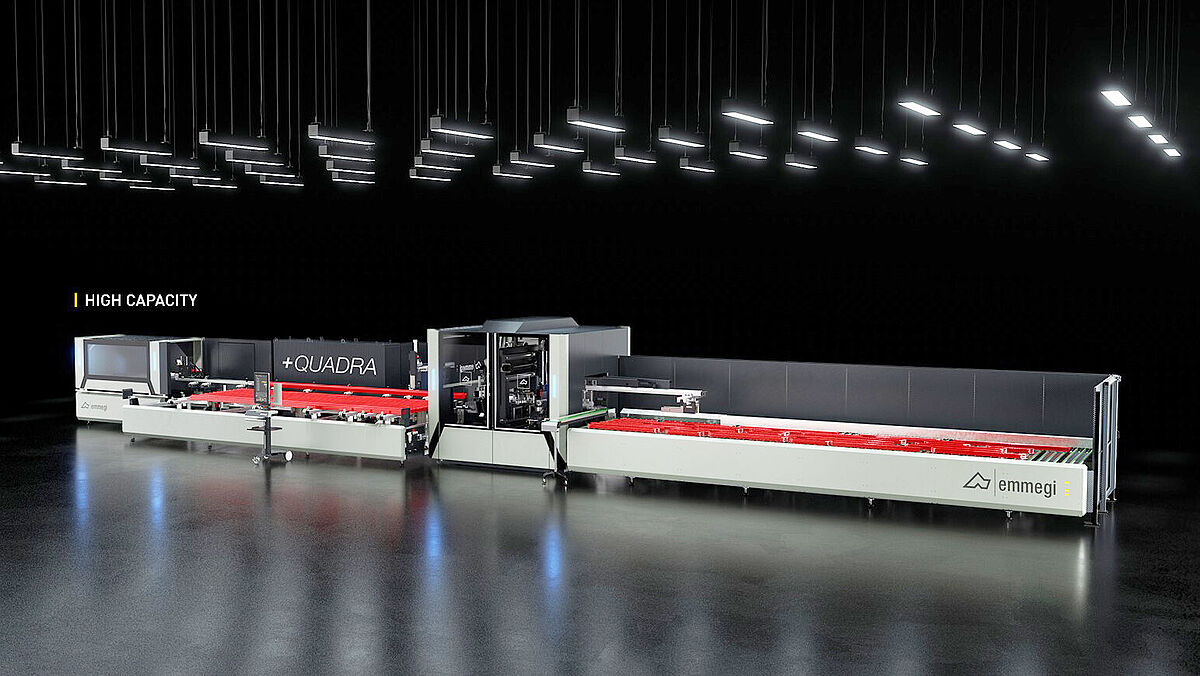 Ein Argument gegen Durchlaufzentren war in der Vergangenheit die fehlende Möglichkeit zur Bearbeitung der Stirnseite analog zu 5-Achs-Profilbearbeitungszentren. Bei der +Quadra stehen je nach Version neben zwei Sägeaggregaten noch eine stirnseitige Ausklink- oder Fräseinheit zur Verfügung, die einen zusätzlichen Freiheitsgrad bieten. Mit den neu servomotorisch verstellbaren Profilhinterlagen der Emmegi +Quadra fallen manuelle Umrüstungen bei verschiedenen Profilserien im Lademagazin praktisch weg. Die Maschine stellt sich automatisch auf den folgenden Profiltyp ein. Eine automatisierte Fertigung ab Seriengrösse 1 ist somit möglich.