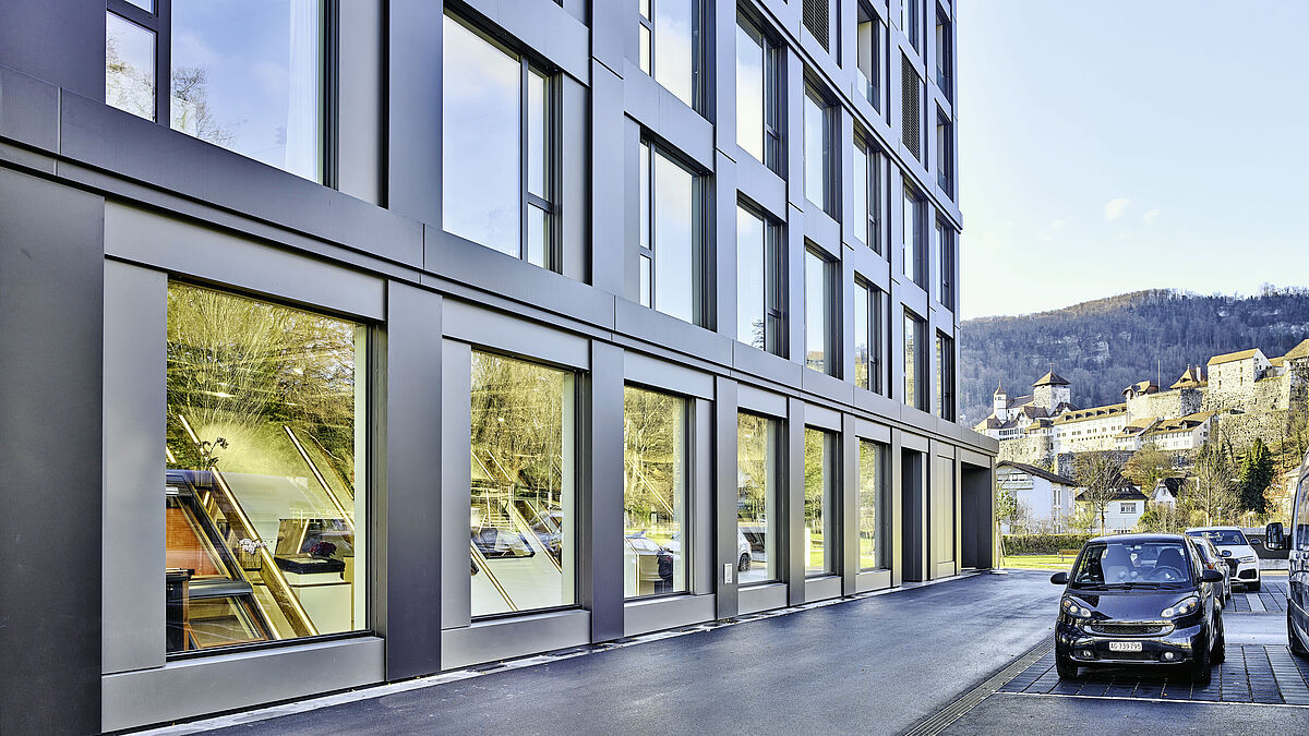 Ein fünfgeschossiger Neubau ist beim Bahnhof Aarburg-Oftringen entstanden. Das Gebäude bildet dank seinem strengen Fassadenraster und der matt schimmernden Metallfassade einen wehrhaften Ruhepol inmitten eines Verkehrsknotenpunkts.