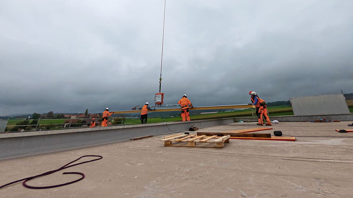 Durch die gute Zusammenarbeit zwischen den verschiedenen Firmen und die gute Vorbereitungsphase konnten viele offene Fragen bereits im Voraus geklärt werden. Auch dank den erfahrenen Monteuren, den Flughelfern und dem Piloten sowie dem einwandfrei funktionierenden VIAVAC Paneelsauger CB5 der Firma Nellos AG konnte das Dach in nur 48 Minuten gedeckt und weitere Pakete nach oben geflogen werden. Das Resultat lässt sich sehen – eine hervorragende Leistung für die erste Montage dieser Art.
