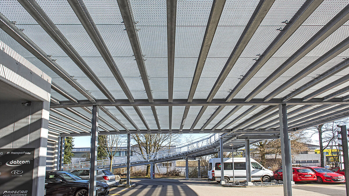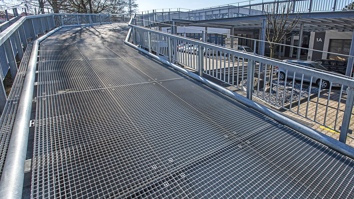 Die Rampe und das Parkdeck sollten mit einem Raddruck von 900 kg belastet werden können. Mit einem Tragstab von 50 x 3 mm und der Maschenweite von 34,3 x 38,1 mm konnte diese Anforderung erfüllt werden.