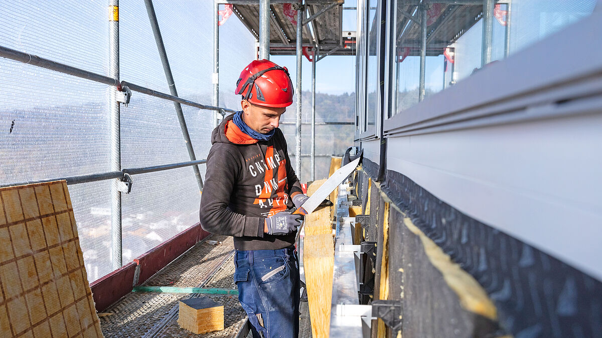 «Vereint mit der in der KBOB-Liste geforderten Ökobilanz erwies sich die Fassadendämmplatte PB F 030 von Isover als der absolut einzige und ideale Dämmstoff für die beiden Türme in Neuhausen», erklärt Sepp Hartmann, Objektverantwortlicher und Mitglied der Geschäftsleitung bei der Ammann & Thürlemann AG, und fügt an: «Die Fassadendämmplatte PB F 030 von Isover erfüllte die geforderten Werte am besten. Dazu kam, dass diese Produkte auch preislich interessant waren und Glaswolle einen optimalen Werkstoff für diese Konstruktionsart darstellt.»