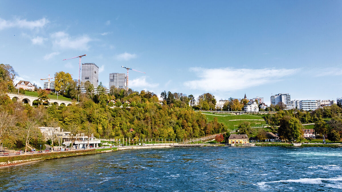«Neues Zuhause / Freie Aussicht», so wirbt Helvetia, die Bauherrin und Eigentümerin, für die beiden Wohnhäuser. Die Aussicht auf den Rheinfall ist tatsächlich atemberaubend. Auch die Nähe zu den Städten Schaffhausen, Winterthur und Zürich, die tolle Infrastruktur der Gemeinde Neuhausen sowie die kurzen Distanzen zur Natur und ihren Erholungs- und Freizeitmöglichkeiten tragen zur Attraktivität bei.