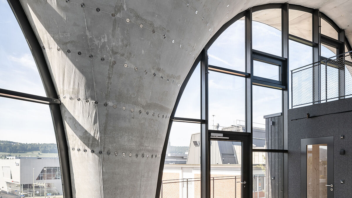 Eine gewölbte, leichte Betonkonstruktion, wie sie hier realisiert wurde, benötigt zwangsläufig lastverteilende Abstützungen. Speziell delikat ist diese Angelegenheit im Bereich des Übergangs von der Verglasung zur Betonhaube, denn die eingesetzten Fassadenelemente sind nicht darauf ausgelegt, das Dach zu stützen. Vielmehr war in diesen Übergangszonen Bewegungsfreiheit gefragt. Hierfür entwickelte die Pletscher Metallbau AG in Zusammenarbeit mit den Architekten und Fachplanern spezielle Unterkonstruktionen. Diese bestehen jeweils aus im Radius verlaufenden, H-förmigen Kastenprofilen mit einer Form im Stil eines Pfeilbogens. Sie ermöglichen eine thermische Trennung, verbinden die Innen- und Aussenseite des gewölbten Betondachs und gewähren neben der notwendigen Bewegungsfreiheit auch ein Nachjustieren des Freiraums zwischen Decke und Fronten. «Speziell an diesen Unterkonstruktionen war», so Reto Wetter, «dass sie sich nicht nur in den Randzonen befinden, sondern das Betondach in gewissen Bereichen darüber hinaussteht. Hier galt es auch, den Kragarm des Betons abzufangen und den thermischen Wärmefluss von innen nach aussen zu unterbinden.»