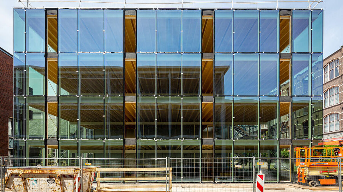 Die transparente Fassade soll die Beziehung dieser Hybridstruktur (Stahlkonstruktion mit Holzelementen und Glasfassade) von Innen- und Aussenbereichen fördern und steht deutlich im Kontrast zu den umliegenden historischen Backsteinbauten.
