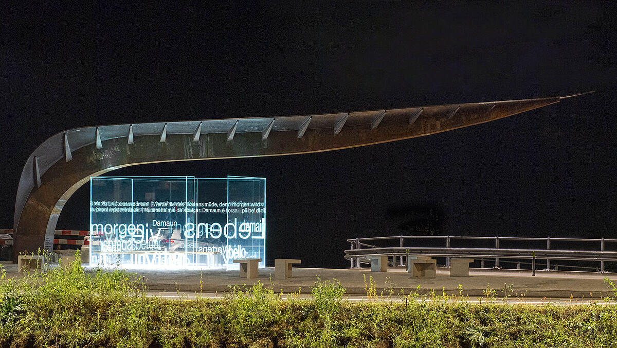 Der Wille zur Erschaffung einer ihre Umgebung stark prägenden Skulptur war für den Architekten Inspiration zum Entwurf dieser «Föia» («Blatt» in der Tessiner Mundart) aus Stahl, deren Ausführung in nur einem einteiligen grossen Monolith ermöglicht wurde. Die Wahl von Cortenstahl mit seinem rostähnlichen Aussehen hängt mit dem Ort Acquarossa zusammen, dessen Name daran erinnert, dass hier Thermalwasser mit hohem Eisengehalt entspringt, das in seinem Verlauf rostrote Spuren hinterlässt. Auch das wellenförmige Design des Bodenbelags aus lokalem Gneis, mit dem der Boden im Wartebereich gepflastert ist, soll ein Verweis auf das Wasser sein. Zur Verstärkung des Monoliths aus Cortenstahl hat man sich für einen verglasten Windfang ohne jegliche Metallträger entschieden.