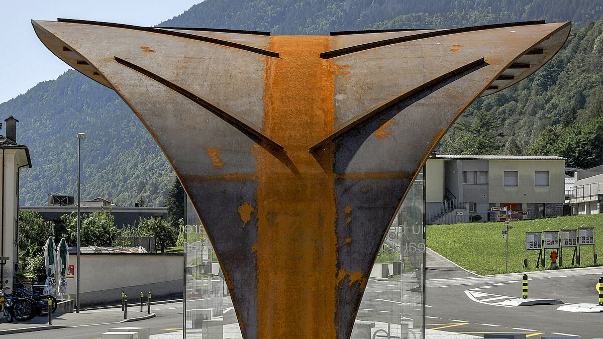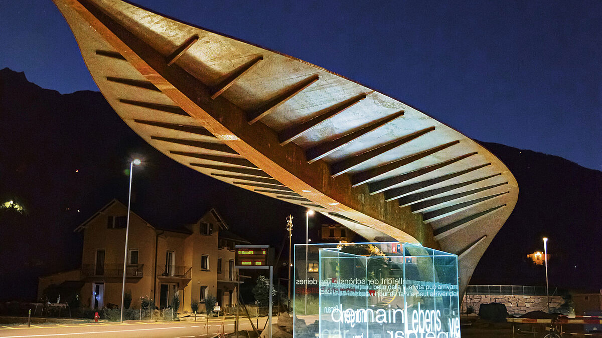 Die Haltestelle aus Cortenstahl entstand nach einem Entwurf von Architekt Davide Conceprio und wurde von der Firma Officine Ghidoni SA auf elegante Weise umgesetzt. Die Funktion des Entwurfs besteht darin, den Fahrgästen der öffentlichen Verkehrsmittel Schutz vor Wind und Wetter zu bieten, und der Entwurf hat die Form eines Blattes.