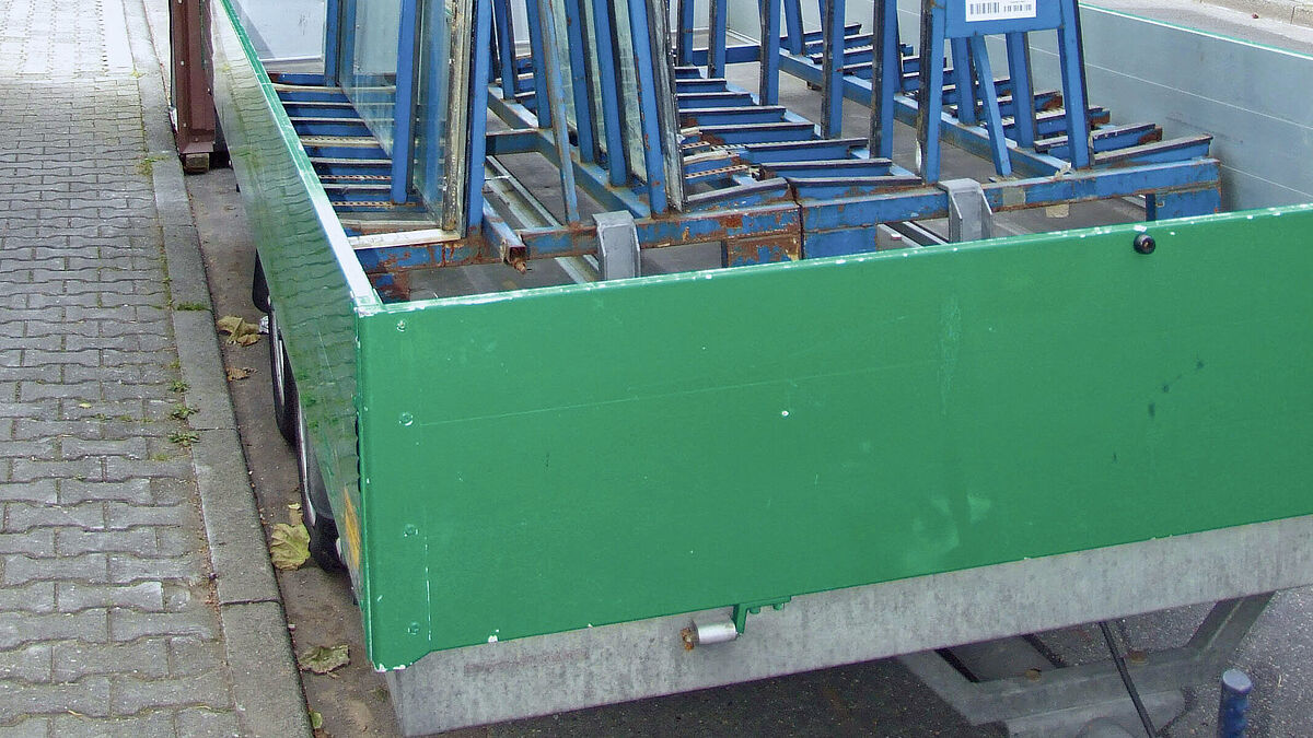 Wird das Glas aus betriebsorganisatorischen Gründen zunächst in die Firma geliefert, ist das Metallbauunternehmen für den späteren Weitertransport zur Baustelle verantwortlich. Die befüllten Transportgestelle können ein erhebliches Gewicht haben, was bei der Auswahl des Transportfahrzeugs zu berücksichtigen ist. Die Ladung ist ausserdem gegen Verrutschen zu sichern, auch wenn eventuell beim Beladen der (falsche) Eindruck entsteht, sie würden wegen ihres hohen Gewichts von allein an Ort und Stelle bleiben – bei plötzlichen Bremsmanövern können grosse Massen auch grosse Kräfte hervorbringen. Die zum Verzurren verwendeten Spannlatten oder Gurte müssen genau dort platziert werden, wo sich innerhalb des Glasstapels die Distanzplättchen befinden. Nur so entsteht ausreichender Gegendruck und die Gläser sind gegen Durchbiegung geschützt.