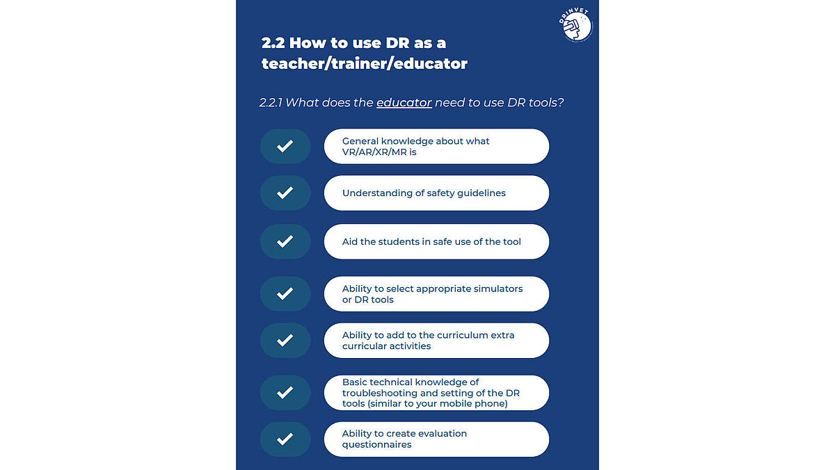 Entwicklung einer spezifischen Pädagogik und Methodik für den Einsatz von DR-Tools sowie von Instrumenten, die die Kompetenzen von Lehrern und Ausbildnern erhöhen und Lehrprozesse ermöglichen, die sicher zu den Lernergebnissen führen, die für den Arbeitsmarkt erforderlich sind.