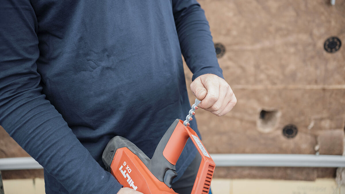 Bei einer Fassadenfläche von knapp 3000 m 2 ist das eine enorme Zeit- und vor allem Kosteneinsparung. Massgeblichen Anteil an dieser Geschwindigkeit hat die Lösung von Hilti: Die Monteure montieren die Fassaden-Unterkonstruktion, indem sie die Konsolen mittels passender Nägel mit Bolzensetzgeräten direkt im Beton befestigen. Damit entfällt das zeitaufwendige Bohren von Dübellöchern. Bei rund 2 500 gesetzten Nägeln ist dies ein nicht zu unterschätzender Vorteil. Anschliessend werden die Dämmplatten ebenfalls mit gesetzten Dämmstoff-Befestigern direkt im Beton gesetzt. Ebenso ist das Ausrichten und die Montage der Alu-Profile der Unterkonstruktion dank Hilti Rotationslaser im Einmannbetrieb möglich.