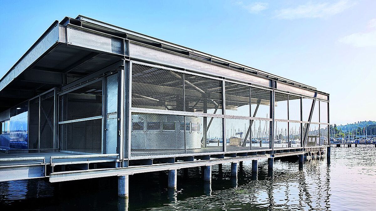 Stahl, Seile und Netzstrukturen sind die verbindenden Bauelemente beider Gebäude. Aus der Ferne betrachtet fügen sich die Bauten stimmig in die umgebende See- und Uferlandschaft. Nähert man sich den Stahlkonstruktionen, so lassen beide Gebäude Ein- und Durchblicke zu. Die filigranen Edelstahlnetze und -seile funktionieren dabei als Trennstrukturen zwischen Aussen und Innen, als luftige Gebäudehülle, an der sogar Pflanzen entlangklettern, und als Brüstung, die vor dem Sturz ins Wasser schützt und dabei überraschend leicht und dezent bleibt. ■
