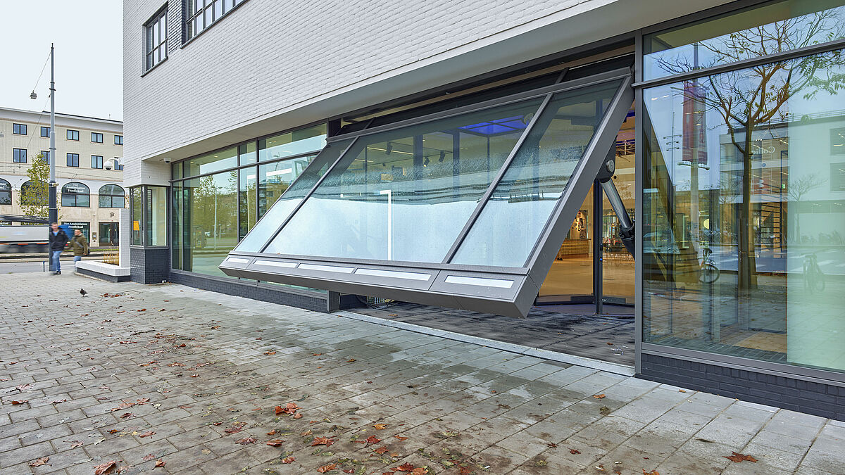 Ein weitere Besonderheit punkto Funktionalität und Design zeigt die dem Stadion zugewandte Bestandsfassade mit dem neuen Haupteingang. Die raumhoch verglaste Konstruktion sieht aus wie eine normale Pfosten-Riegel-Fassade. Erst bei genauerem Hinschauen erkennt man, dass sich ein Fassadenelement im Brüstungsbereich von den anderen unterscheidet. Es kann mit einem Hydrauliksystem um 90 Grad nach oben geschwenkt werden. Die beiden schweren Hydraulikzylinder sind stabil auf einem Bodenfundament verankert.