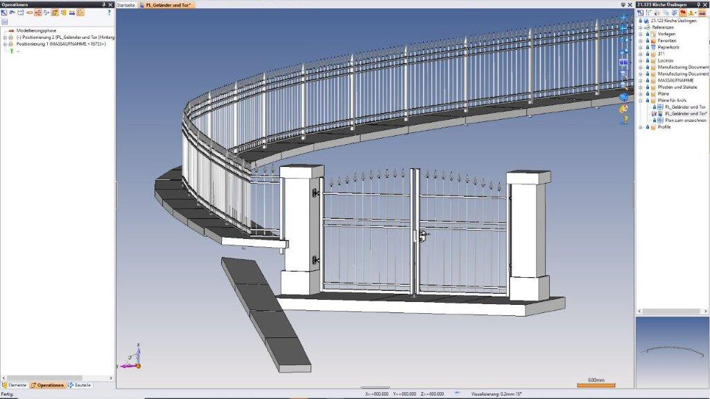 Den Auftrag für das Geländer haben wir bewusst als Projekt für die Einführung von TopSolid’Steel gewählt. Das Tor und das Geländer mussten bestmöglich an ein Mustergeländer angepasst werden, welches vom Heimatschutz vorgegeben wurde. Das schwierige am Projekt waren die runden und schrägen Flächen sowie der Geländerverlauf, welcher sich über die ganze Mauer zog. Nach der Konstruktion mit 3D durch TopSolid’Steel konnten wir das Projekt für die Kirche starten.