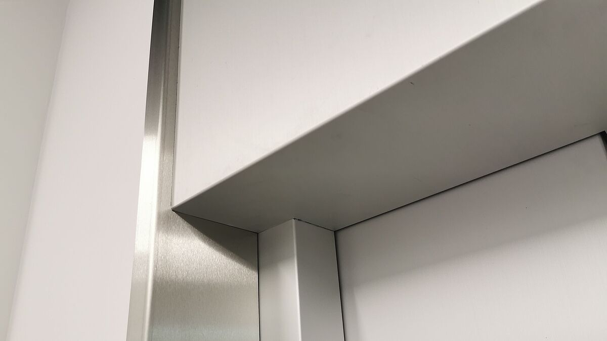 Ein besonderes Detail sind die Sturzverkleidungsbleche. Sie wurden eingehängt und kommen ganz ohne sichtbare Schrauben aus. Das verstärkt die gewünschte architektonische Reduktion und bringt visuelle Ruhe in den Liftzugang. Die Linie der Fassade wird damit über die Lifttür hinaus weitergeführt – ein kleines, aber wirkungsvolles Element.