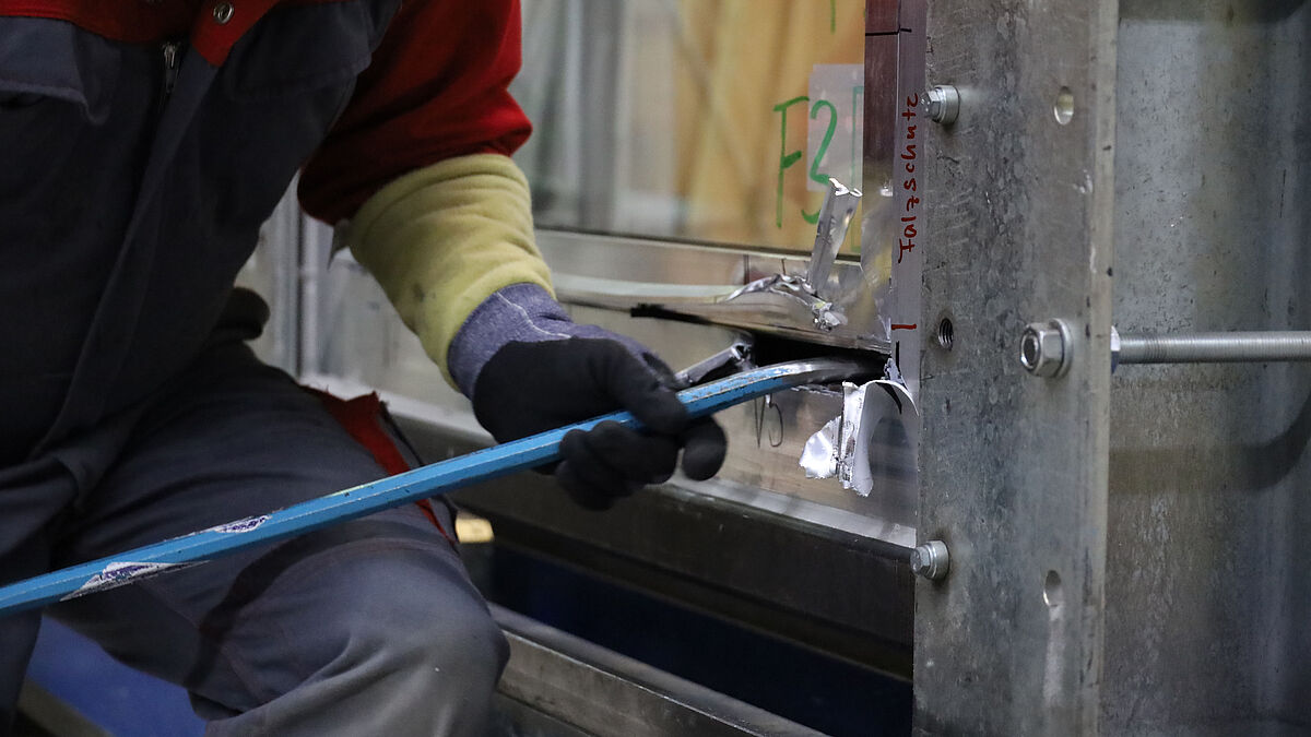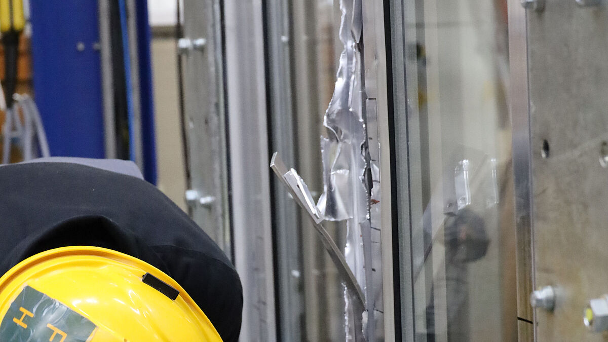 Auch Versuche, das Glas aus dem Glasfalz zu lösen und eine Glasecke über die Diagonale zu biegen, blieben erfolglos. Die eingesetzten 3-fach Isoliergläser mit Verbundsicherheitsglas der Qualität P6b hielten den Belastungen bestens stand.
