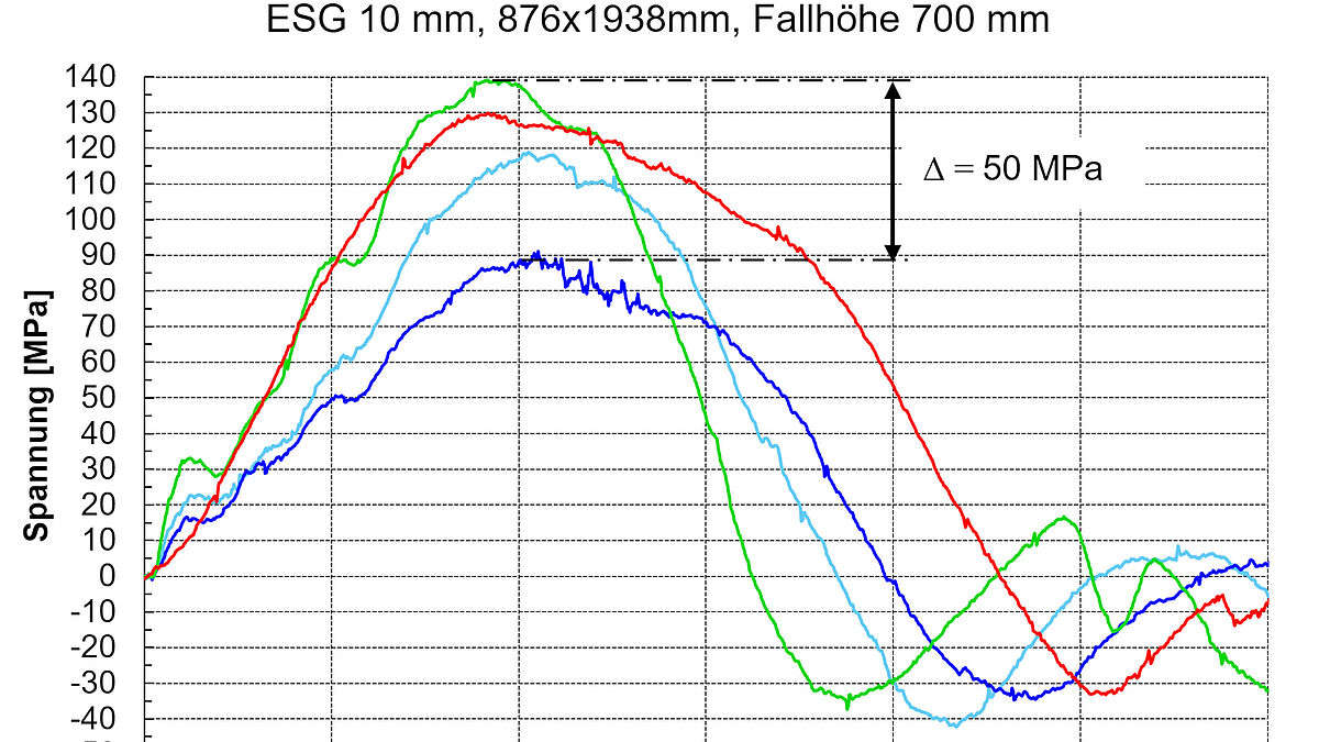 Voruntersuchungen, die an der HSLU unter anderem im Rahmen von zwei Bachelorarbeiten und einer Masterarbeit durchgeführt worden sind, zeigen erhebliche Unterschiede zwischen den Auswirkungen unterschiedlicher Stosskörper auf (Abbildung 3). So erzeugt ein 50 kg schwerer Sandsack beim Aufschlag eine um das 1,5-fache höhere Zugspannung im Glas als ein sphärokonischer Sack gleichen Gewichts mit Leinenhülle. Für 700 mm Fallhöhe ist das als Beispiel ein Unterschied von 50 MPa. Bereits die Wahl einer steiferen Hülle für den ansonsten identischen sphärokonischen Kugelsack zeigt erhebliche Unterschiede bei den Spannungsergebnissen im Glas: Mit einer Hülle aus Plane ergeben sich um ein Drittel höhere Spannungen als für eine weiche Leinenhülle. Dies zeigt deutlich, dass der Wahl eines geeigneten Stosskörpers und dessen exakter Definition eine grosse Bedeutung zukommt, um reproduzierbare Ergebnisse zu erhalten und um sicher und wirtschaftlich bemessen zu können. Der Stosskörper muss zudem typische Stösse, wie sie auf einem betretbaren Glas beispielsweise durch ein Stürzen von Personen auftreten, sinnvoll abbilden können. Hierbei gibt es Unterschiede zu den Stössen, die auf vertikale, absturzsichernde Verglasungen wirken.