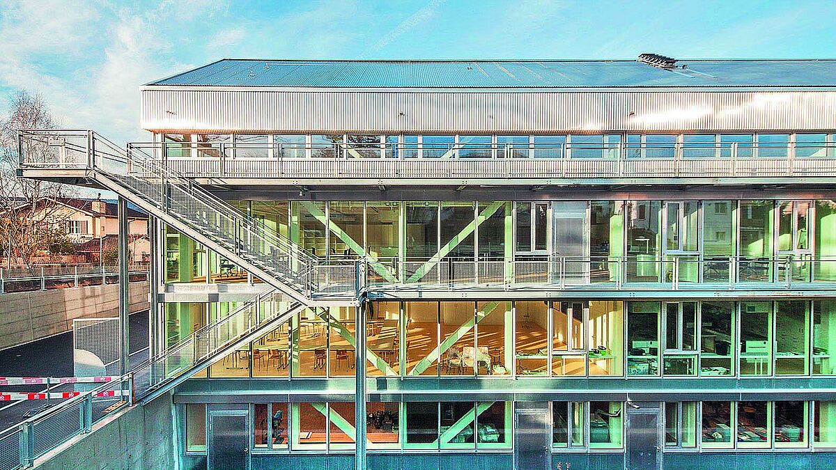 Auf den ersten Blick könnte man meinen, man stehe einer modernen Gewerbehalle gegenüber. Die Sheddächer mit der markanten Wellblech-Aluminium-Fassade beherbergen allerdings keine Maschinen, sondern Wichtigeres: die nächste Generation der Maschinenführer, sprich Schülerinnen und Schüler. Das hochkompakte Gebäude dieser Atelierschule – der Sekundarschule Laufen – ist ein Erfolgsmodell. Mit dem Prinzip seines Aufbaus hat Thomas Fischer Architekt nun bereits mehrere Wettbewerbe für sich entscheiden können, etwa die Schule Krämeracker in Uster (WB 2008) oder die 2018 realisierte Schulanlage Neuhegi in Winterthur (WB 2012).