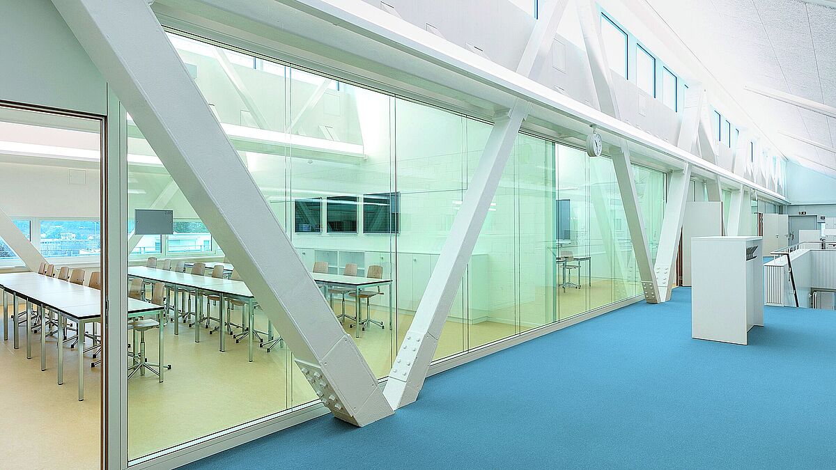 Die Anordnung der Räume übereinander ergibt ein klassisches Ingenieurproblem: unten eine Halle, die knapp 30 m überspannt, und darüber Lasten von intensiv genutzten Schulräumen. Um die erforderlichen Träger nicht zu dominant werden zu lassen, lösten die Planenden dieses Problem mit Stahlfachwerken – und was für welchen! Die fünf Fachwerkträger über der Doppelsporthalle und der Aula sind doppelraumhoch (5946 mm) ausgebildet und bilden gleichzeitig die Wandebenen mit den Oberlichtern der Sheddächer. Auf den ersten Blick fallen sie gar nicht unbedingt als erforderliches Deckentragsystem für die Turnhalle beziehungsweise als hoch gehängtes Bodentragsystem des zweiten Stockwerks ins Auge. Die grosse statische Höhe führte bei den Fachwerkelementen zu einer Minimierung der erforderlichen Querschnitte. Die Obergurte dieser grossen Fachwerkträger bestehen aus HEB-400-Profilen, bei den Diagonalen finden HEA-200-, HEA-300- und HEB-300-Profile Verwendung. Die Seiten der Profile sind aus Gründen der Statik und des Korrosionsschutzes mit Stahlblechen von 15 beziehungsweise 10 mm Stärke gasdicht verschweisst. Zudem reduziert die Verschweissung die Oberfläche des Brandschutzanstrichs. Im Beton der Sporthallendecke eingegossene Träger mit HEM-180-Profil bilden den Untergurt. Für den nötigen Verbund sorgen am Steg angeschweisste Kopfbolzendübel. Auffällig sind zwischen den Diagonalstäben eingesetzte Riegel mit quadratischem Hohlprofil (RRW 200 × 200). Auf ihnen fusst die Traufe der Sheddächer. Die Idee zum statischen raumhohen Stahlträger, der öffentliche Räume überspannt, ist laut dem Architekten Thomas Fischer die Lösung für ein städtebauliches Problem und die Antwort auf die damit verbundene typologische Fragestellung. Das in der Sekundarschule Laufen elegant eingebundene Tragwerk ermöglicht daher die Umsetzung des Programms als Pavillonschule « zwischen Sporthalle und Himmel». 45 × 57 m messen die Lernlandschaften im 2. Obergeschoss unterhalb des Sheddachs. Da die grossen Fachwerkträger nur den Teil über der Sporthalle und der Aula überspannen, sind sie mit kleineren Fachwerkbindern ergänzt, die nur das Dach tragen. An der Südseite des Gebäudes bieten sie Ausbaumöglichkeiten zu stützenfreien Hallen für künftige Lernlandschaften.