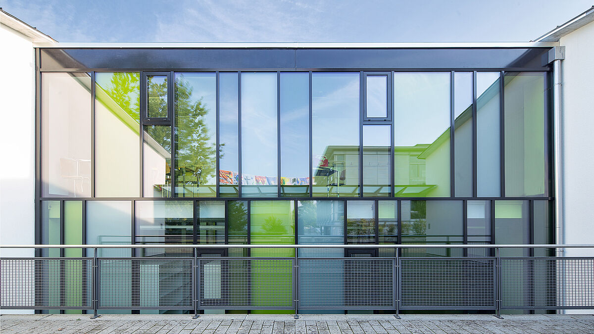 Im Zuge einer Sanierung des Schulhauses Waldegg in Rotkreuz verbauten die Architekten an verschiedenen Bauteilen farbiges Glas. Die vielen verschiedenen Farbtöne verleihen den Schulhäusern eine enorme Lebendigkeit und Frische.