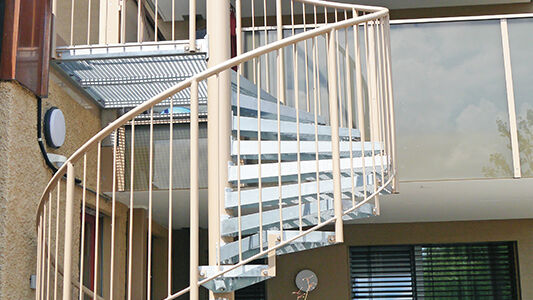 Um die Terrasse eines Altbaus mit einem Balkon und einer anderen Terrasse eines angebauten Neubaus in den oberen Stockwerken zu verbinden, wurde eine Spindeltreppe benötigt. Diese sollte an der Fassade der älteren Hauswand angebracht werden. Herausforderungen bei diesem Projekt waren die stabile Befestigung an der bröckelnden Fassade und der Übertritt des Spindeltreppenpodests auf die Balkone bzw. Terrassen.