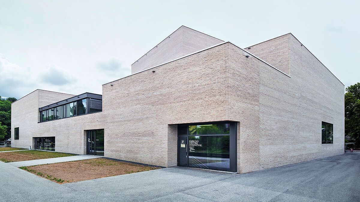 Ein besonderes Augenmerk legten die Architekten von Pont12 auf die nahtlose Einbindung des Bestands in den Hochbauentwurf. So wurden auch im Rahmen der Erneuerung des benachbarten Festsaals die Erschliessungselemente voll verglast und kontrastieren nun als filigrane Bänder mit der ansonsten massiv ausgeführten Gebäudehülle. Diese ist mit länglichen Klinkerziegeln in einem hellbeigen Ton bekleidet, die eine natürlich-rustikale Oberfläche aufweisen und wie von Hand geformt wirken. In bestimmten Fassadenbereichen, wie etwa oberhalb des Eingangs, lockern perforierte Ziegelwände die Massivität auf.