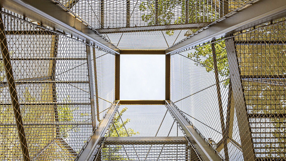 Für die Verkleidung und Absicherung des Treppenauges im Zentrum des Turms suchten wir nach einer grobmaschigeren Lösung und entschieden uns für Webnet von Jakob Rope Systems. Das Netz besteht aus Edelstahl und ist mit einer PVD-Goldbeschichtung (Vakuumbeschichtungsverfahren) veredelt. Auch bei der Farbauswahl machten wir es uns nicht leicht: Wir hatten viele verschiedene Farbnuancen gegenübergestellt und diese bei unterschiedlichsten Lichtverhältnissen, gemeinsam mit der kantonalen Denkmalpflege, verglichen, bis wir uns für die Pulverbeschichtung in IGP-HWF classic 5903, 5903 E82303 S3F entschieden.»