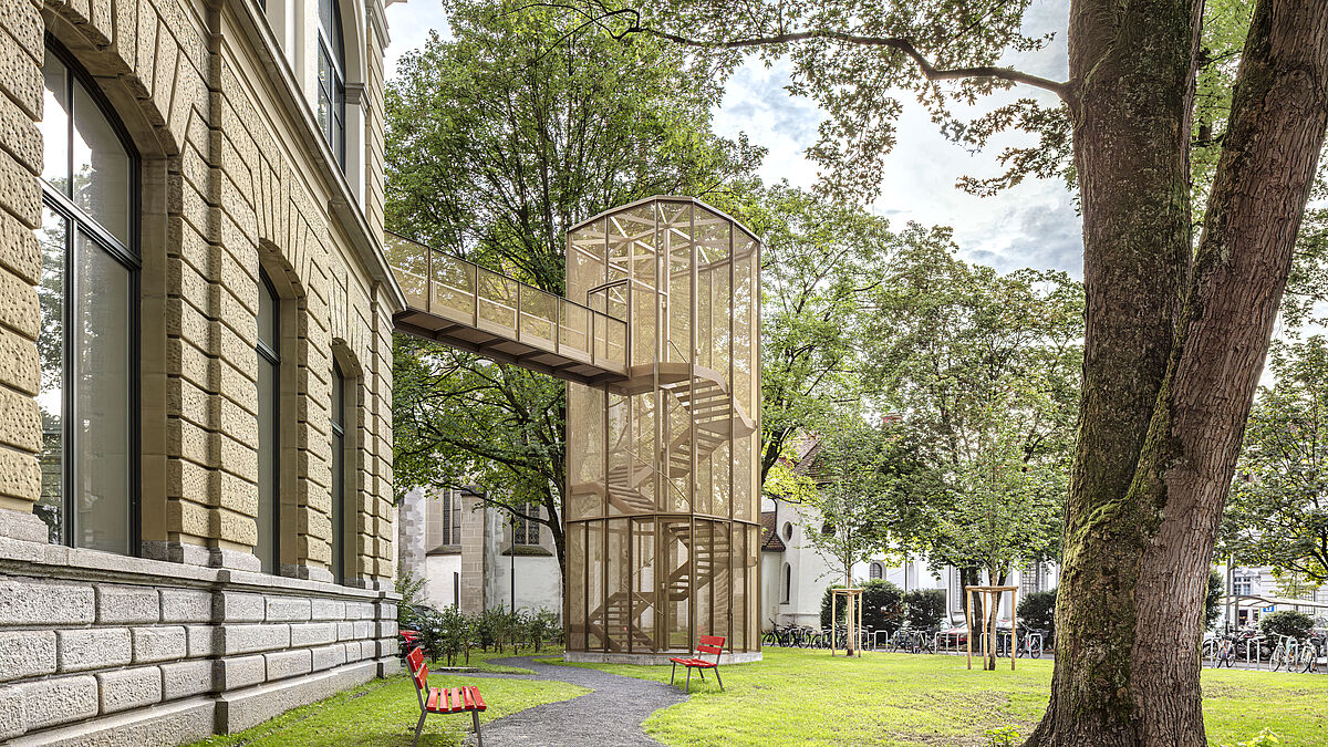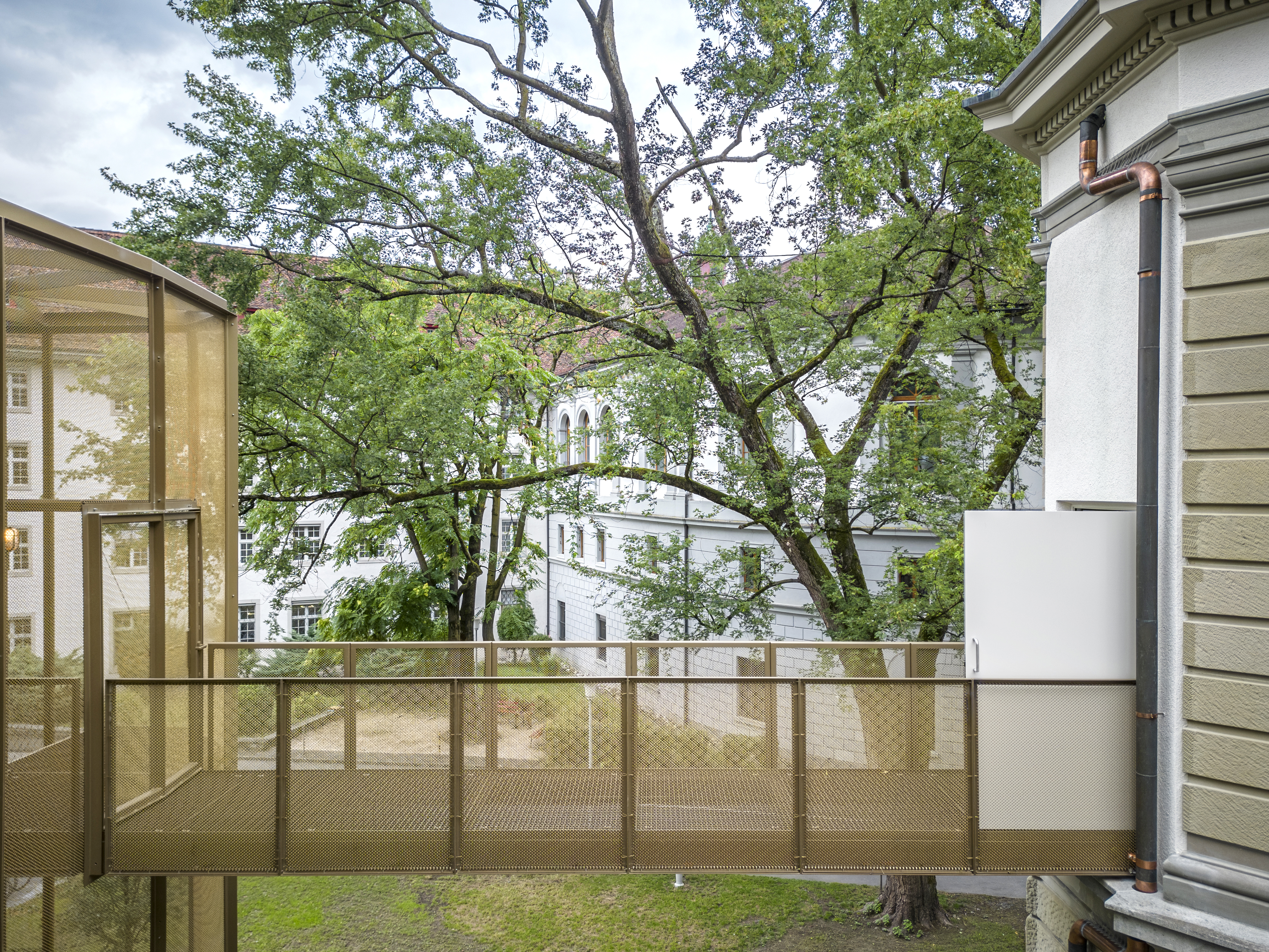 «Wir wollten einen Treppenturm konzipieren, der sich additiv und reversibel zum Bestand verhält», erklärt Céline Burgener, verantwortliche Projektleiterin bei RHA, im Zuge der Objektbegehung und fügt an: «Uns war wichtig, dass die Sichtbezüge zum historischen Gebäude von aussen möglichst uneingeschränkt erhalten bleiben. Darum haben wir den Treppenturm von der bestehenden Fassade abgelöst und ihn in die direkte Verlängerung der nordwestlichen Ecke der Aula gestellt. So bleibt die Fassade der Aula sowohl von Westen wie auch von Norden her als Ganzes erlebbar und der Treppenturm wird als Teil des parkähnlichen Grünraums gelesen. Diese konzeptionellen Grundsatzentscheide deckten sich zudem mit den Anforderungen seitens Ortsbild- und Umgebungsschutz»