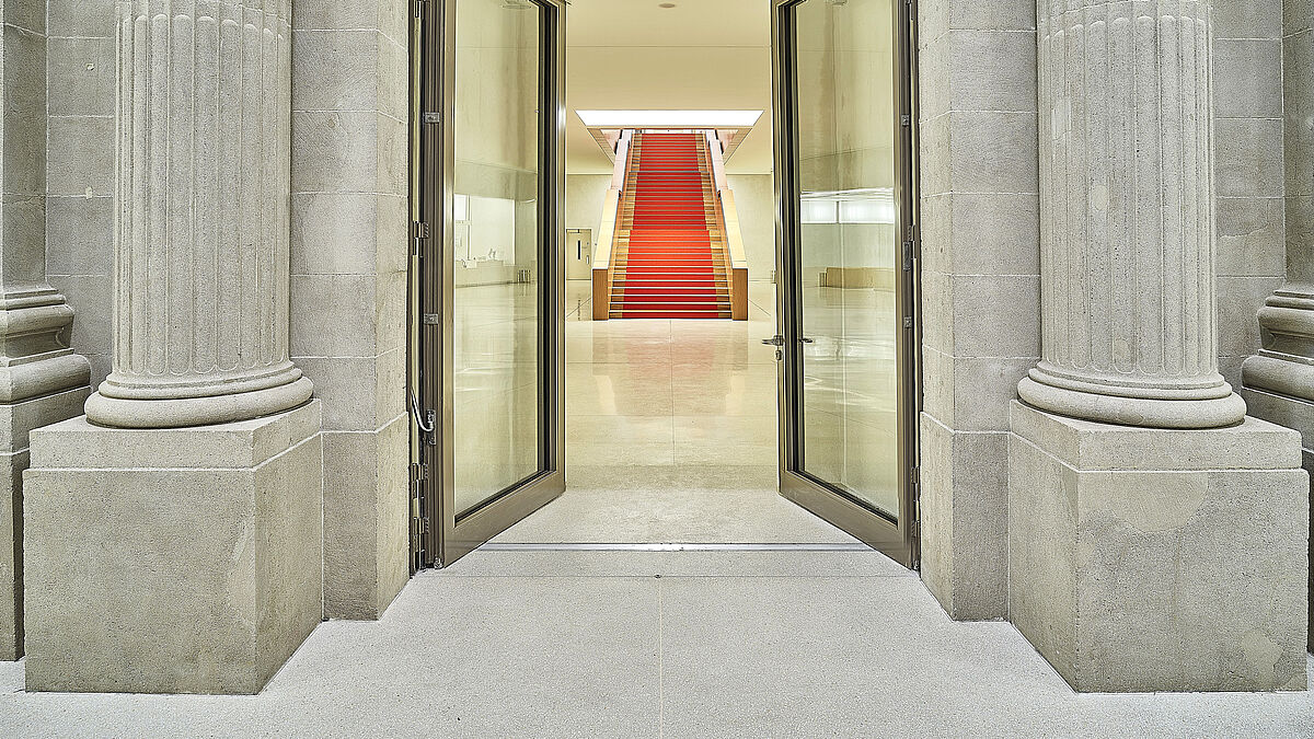 An der Erschliessungsachse von der offenen Eingangshalle Unter den Linden über den denkmalgeschützten Brunnenhof und die zentrale Treppenhalle in das Vestibül markiert eine zweiflügelige Brandschutztüre im zeitgemässen Design den Übergang vom Altbau in den Neubau mit dem Allgemeinen Lesesaal der Berliner Staatsbibliothek. Gefertigt wurde sie aus dem Stahlprofilsystem Janisol 2 von Jansen.