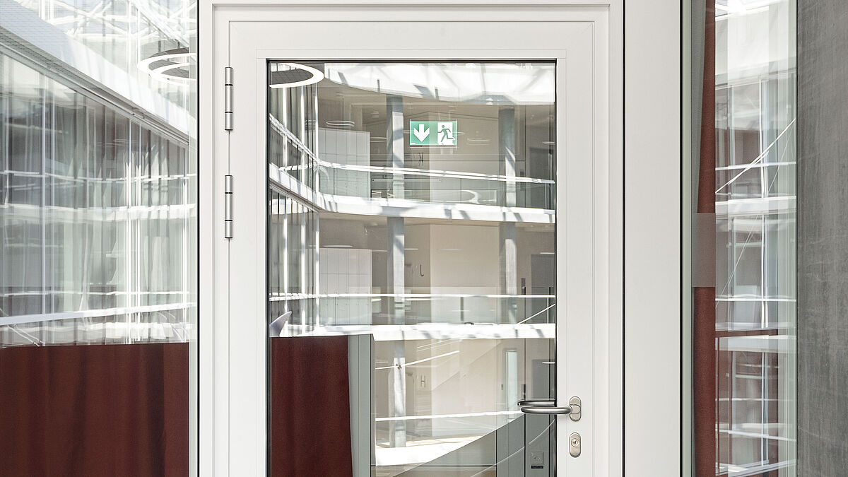 Als ideale Ergänzung dazu fungieren Janisol 2 EI30 Brandschutztüren und Jansen Economy 50 Türen. Das Brandschutzsystem Janisol 2 erfüllt mit seinen multifunktionalen und ebenfalls hochwärmegedämmten Türen in gleichem Masse die Ansprüche in Bezug auf bauliche Sicherheit und gestalterische Freiheit. Insgesamt wurde im Gebäude eine Stückzahl von 309 ein- und zweiflügeligen Brandschutztüren, davon 33 einflügelige Türen mit Beistoss E30 und 40 einflügelige Türen mit Oblichtern und Seitenteilen, ohne Anforderung, verbaut.