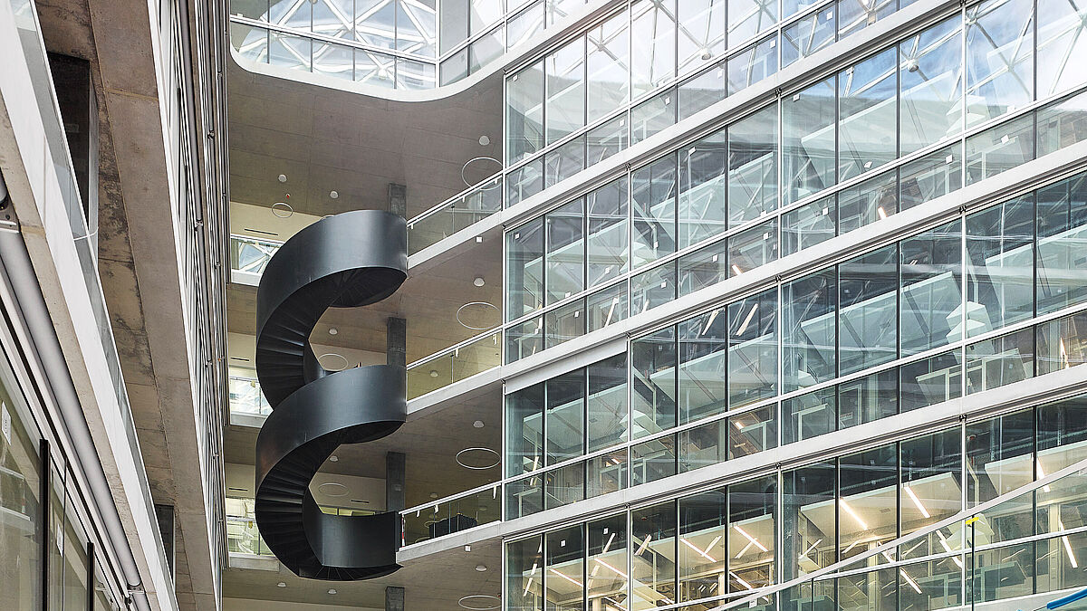 Das Atrium mit seinen zueinander versetzten Terrassen ist zentraler Begegnungs- und Kommunikationsort der Hochschuleinrichtung. Es wird von einer gläsernen Kuppel überspannt (die «metall» hatte in der Ausgabe Januar 2022 darüber berichtet) und bietet damit rund ums Jahr einen witterungsgeschützten Platz für Begegnungen. Die innenliegende Fassade des Gebäudes ist durchgängig transparent gestaltet. Hier kam eine Pfosten-Riegel-Konstruktion vom Typ VISS Fire, EI30 (50 mm) mit objektbezogenen T-Verbindern zum Einsatz. Die wärmegedämmte, auf dem System der Trockenverglasung basierende Konstruktion eignet sich ideal für grossflächige Vertikalfassaden. Mit ihren hochisolierten Stahlprofilen ermöglicht sie einerseits die Umsetzung des angestrebten Baustandards Minergie-ECO und «Gutes Innenraumklima» sowie die Anlehnung an die Zielvorgaben A des SIA-Effizienzpfads Energie (SEE), Bauen für die 2000-Watt-Gesellschaft. Andererseits ist die VISS Fassade im Hinblick auf das Laborumfeld als Brandschutzfassade ausgebildet. Das System VISS Fire mit diversen Zusatzkomponenten wie Brandschutzanker, Anpressprofilen aus Edelstahl etc. hält auch im Brandfall die Scheiben in der richtigen Position. So wird der Durchtritt von Feuer zuverlässig verhindert. Mit einer Ansichtsbreite von nur 50 Millimetern konnten die brandschutztechnischen Anforderungen besonders dezent und elegant umgesetzt werden.