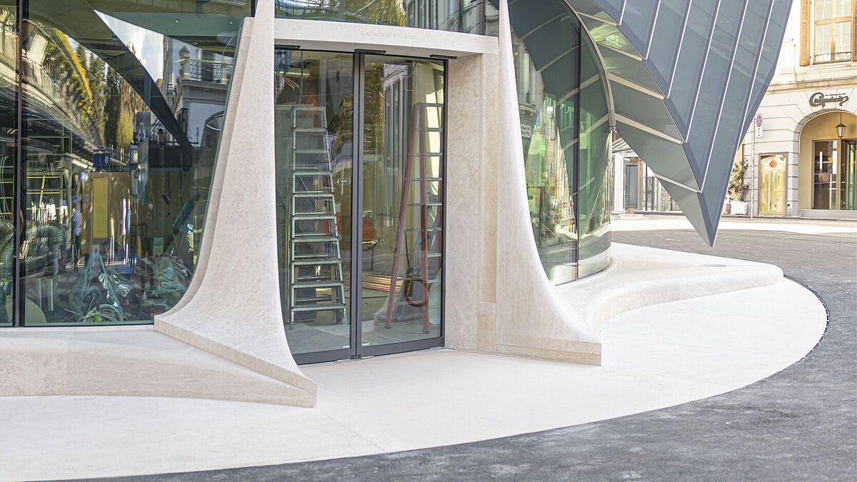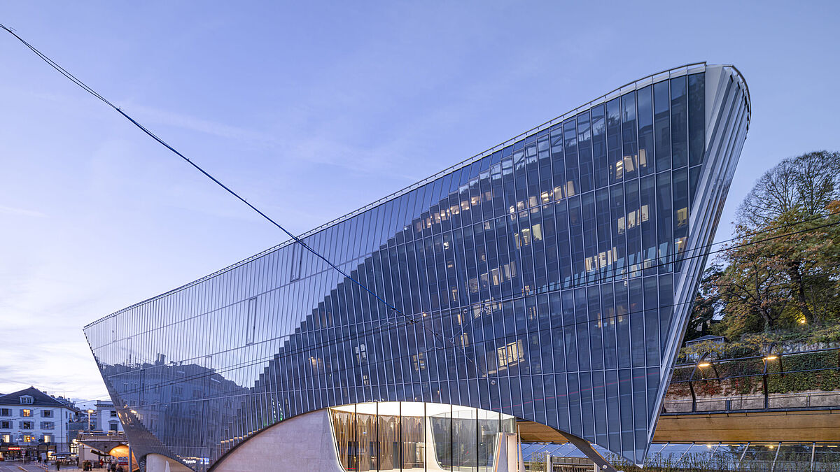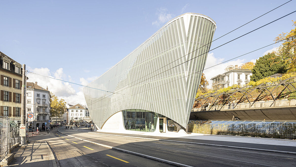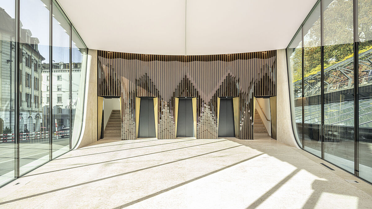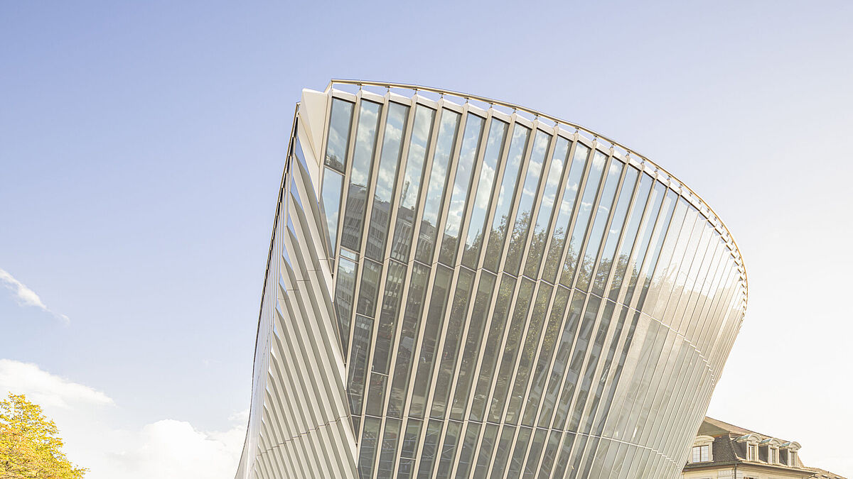 Der Dachrand bildet eine durchgehende, horizontale Linie, während die Fassade zum Boden hin in einer dynamischen Bogenform abschliesst. Besonders im Bereich der Zugänge schaffen die hohen Bögen Raum für Personenverkehr und Tageslichteinfall. Im zurückversetzten Erdgeschoss bildet eine Rundbogenverglasung den unteren Abschluss der Fassade, die zu den stirnseitigen Eingängen ausgerichtet ist und eine Höhe von 4,60 Metern erreicht.