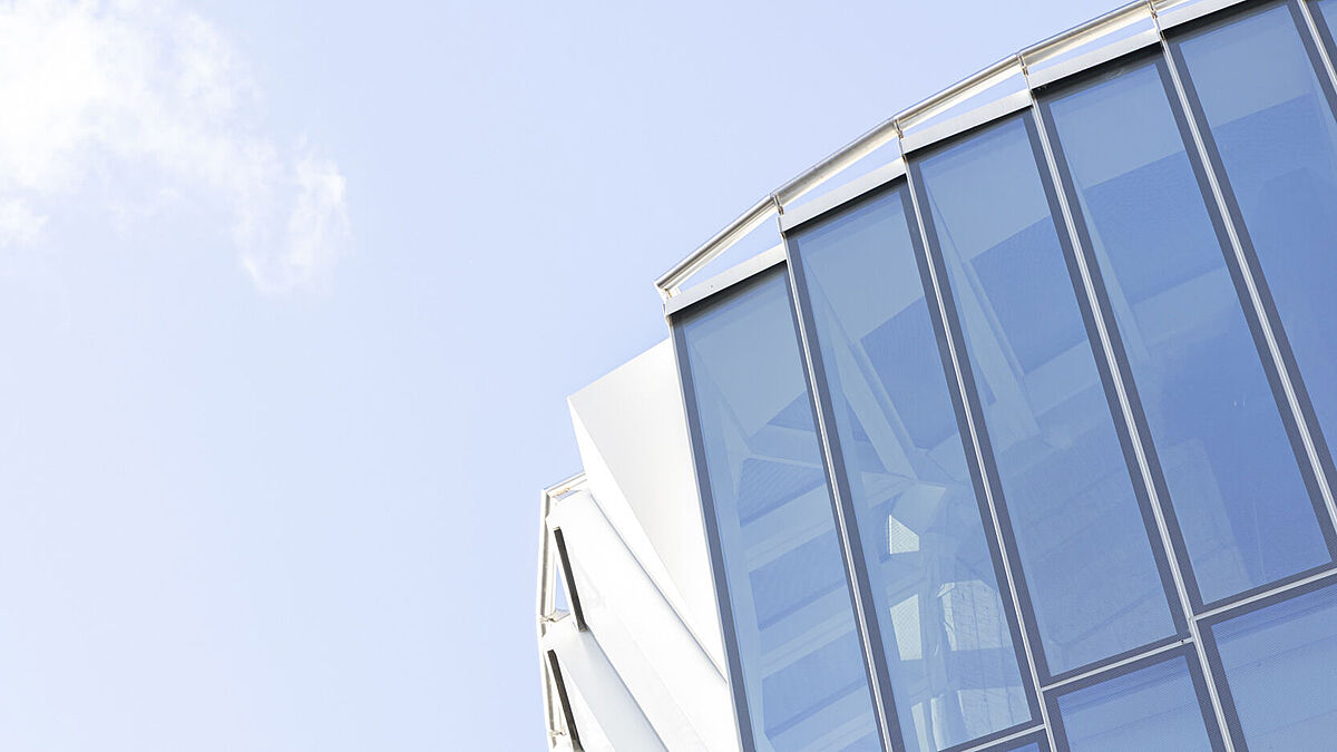 Die Glasvorhangfassade besteht aus acht Einzelflächen, die sich in komplexer Geometrie zu einer markanten, facettierten Gebäudehülle fügen. Die Fassadenhaut übernimmt dabei keine tragende Funktion.