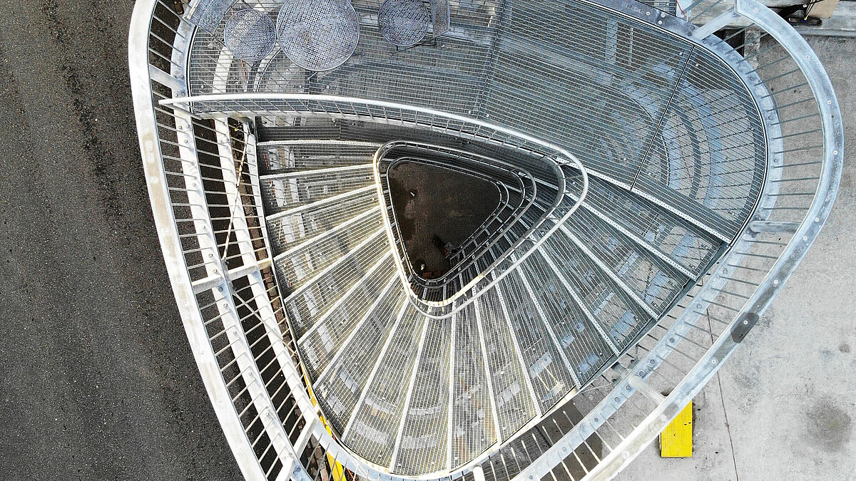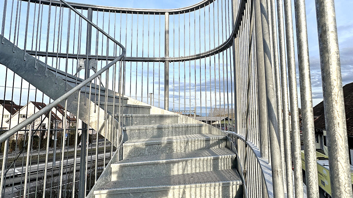 Die feinmaschigen, rutschhemmenden Gitterroststufen lagern direkt auf den erwähnten Blechprofilen und sind über Klemmhalter befestigt. Sämtliche Gitterroste – für Stufen und Podeste – wurden gemäss Planvorgaben innen und aussen in radialer Form hergestellt.