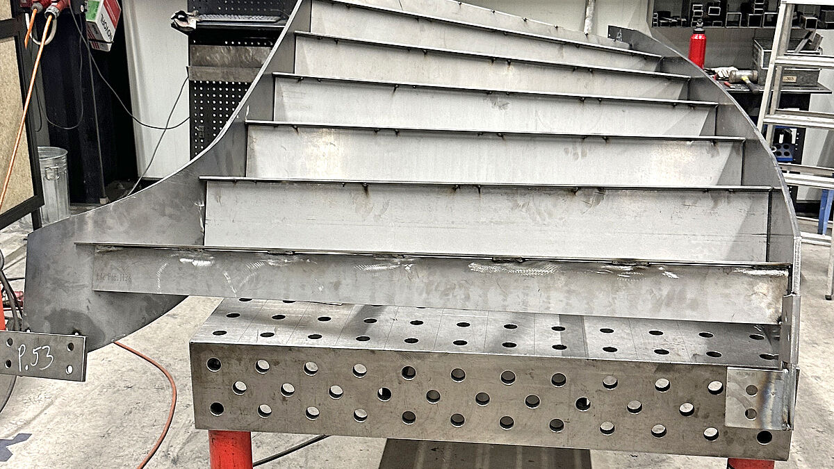 Die statische Verbindung zwischen Innen- und Aussenwange wird durch eingeschweisste, lasergeschnittene und winkelförmig abgekantete Stahlbleche 5 mm gewährleistet. Diese entsprechen exakt der Anordnung der darauf lagernden Gitterroststufen.