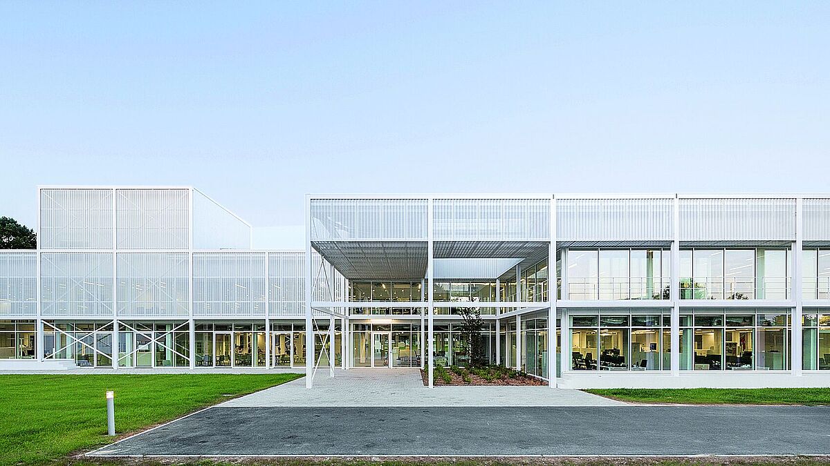 Die Stahlfachwerkbinder des Dachs liegen auf Stahlstützen aussen vor den Fassaden auf. Dahinter fügten die Architekten schmale Gitterrostbalkone ein; die Zwischenräume zwischen den Stützen sind im Obergeschoss zum grössten Teil mit Schatten spendendem, gelochtem Wellblech ausgefacht. Dagegen erlaubt die Glasfassade zu ebener Erde weitgehend ungehinderte Einblicke ins Haus. Auch dort ist – wie schon an der Fassade – Weiss die alles dominierende Farbe. Der weitläufige Hallenraum ist als Abfolge von Grossraumbüros erhalten geblieben, die durch eingestellte Kuben mit kleineren Besprechungs- und Gruppenarbeitsräumen zoniert wird. ■