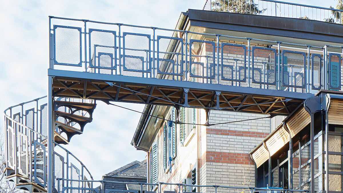 Spannend wirkt auch die für die Erschliessung der drei Ebenen angebaute Spindeltreppe. Die am Spindelrohr angeschweissten Stufen sind als einzelne Schalen aus lasergeschnittenen Stahlblechen zusammengeschweisst. Die Gehflächen sind mit Holz belegt. An den einzelnen Geländerpfosten ist jeweils oben ein Rohrstotzen zur Durchführung des Drahtseils, das als Handlauf wirkt, angeschweisst. Die Füllelemente bestehen aus formschönen Stahlrahmen, versehen mit eingesetzten Streckmetallen.