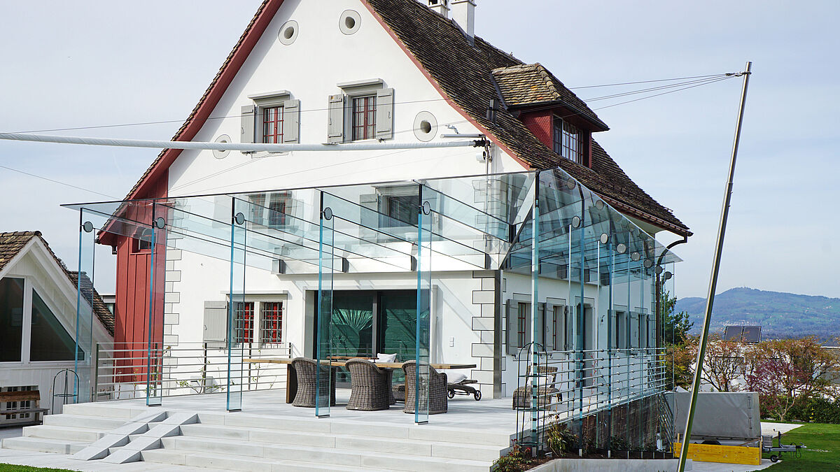 Äusserst leicht und transparent wirkt die gläserne Pergola am steinernen Wohnhaus. Die edle Erscheinung ist geprägt von Innovationsgeist, modernster Glastechnik und höchster Präzision.