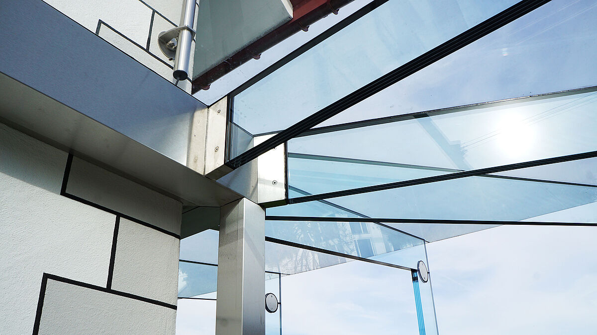 Primär besteht die ganze Glaskonstruktion aus 13 Glasstützen und ebenso vielen Glasträgern. Darauf lagern 12 einzelne Glasscheiben, die zum Teil wesentlich unterschiedliche geometrische Formen aufweisen. Die grössten Gläser sind 5,90 m lang und 1,75 m breit und loten das technisch Machbare für eine derartige Konstruktion aus. Alle äusseren und alle gebäudeseitigen Glaskanten verlaufen horizontal. Diese Tatsache, in Kombination mit der sich verjüngenden Dachfläche, führt zur entsprechend geknickten Scheitellinie, welche ebenfalls von einem Glasträger unterstützt wird. Das Meteorwasser wird gegen das Gebäude geführt und über die an der Fassade angebrachte Rinne im Stützrohr an der Gebäudeecke abgeleitet.