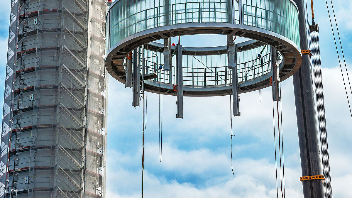 Nach dem Zusammenbau und der Verglasung am Boden erfolgte der Aufbau des Riesenkrans. Hierfür wiederum waren ein weiterer, leichterer Pneukran und sechs Sattelschlepper mit Kranzubehör notwendig. Der eigentliche Hebe- und Platzierungsakt dauerte dann lediglich 30 Minuten. Anschliessend erfolgten die Verankerungen in die Kaminwand.» Mit dem Rückbau des Gerüsts traten auch die frischen Farben Rot und Weiss in Erscheinung und der Turm wirkt im neuen Kleid tatsächlich wie das Wahrzeichen des einstigen Industriequartiers. ■