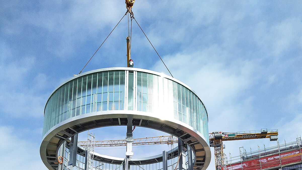 «Eine ganz besondere und auch nicht alltägliche Herausforderung erwartete unser Team mit der Montage des Kaminkranzes», erklärt Daniel Vonrüti, Mitinhaber und CEO Verkauf & Technik der Blaser Metallbau AG, gegenüber der «metall». «Höhe und Gewicht» – so Vonrüti weiter – «bildeten die zentralen Parameter, die es zu berücksichtigen galt. Mit 14 Tonnen für den Helikopter zu schwer und mit über 90 Metern Hebehöhe für die meisten Krantypen zu hoch, fanden wir mit einem der grössten Pneukräne Europas doch eine passende Lösung. Zudem war eine genaue Ausrichtung – den Himmelsrichtungen entsprechend – gefordert.