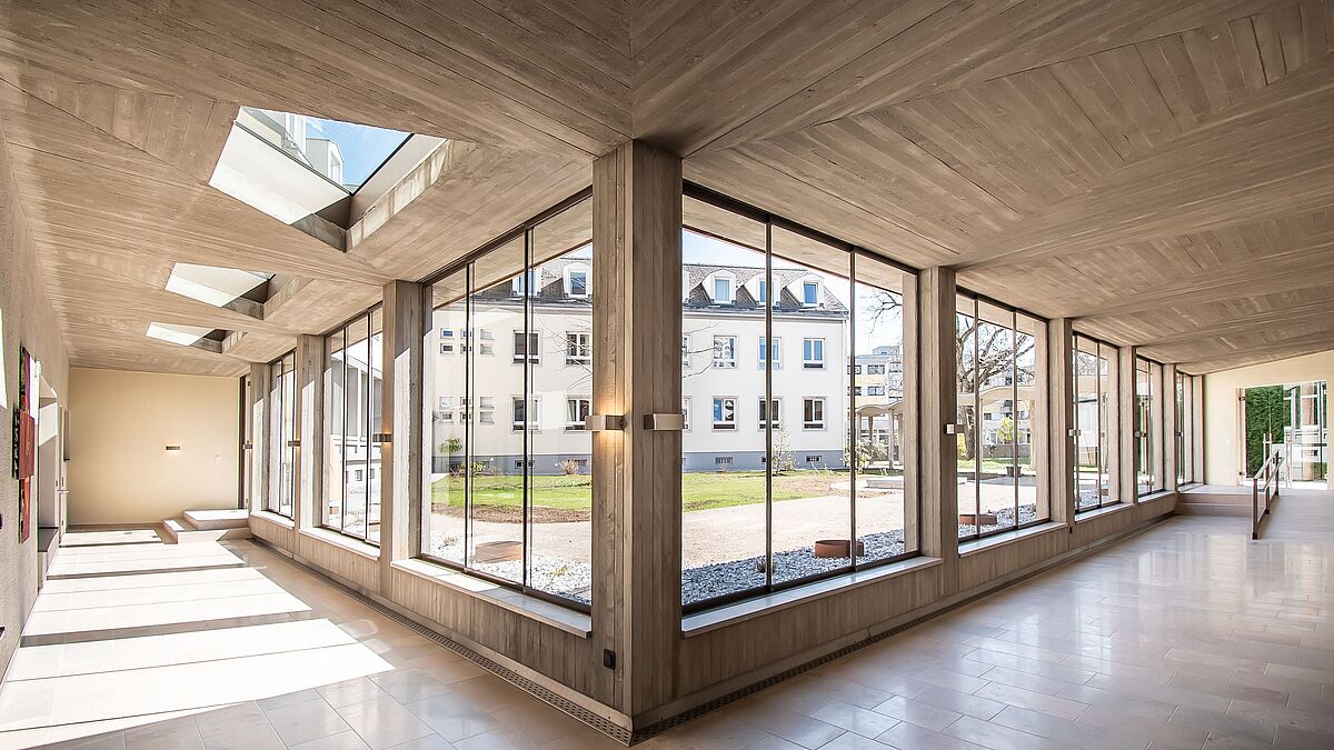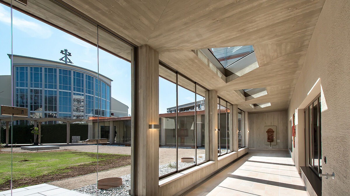 Ein grosser Wunsch der Klosterschwestern war, dass der neue Kreuzgangabschnitt ganzjährig genutzt werden kann. Um dem zu entsprechen, schloss ihn der Architekt mithilfe des Schiebesystems GM Toproll 10/14 von Glas Marte zum Innenhof ab. Hierbei wird die Last des Glases nicht – wie oft üblich – in den Boden abgeleitet. Sondern das Glas wird in ein Schiebesystem eingehängt, das an der Decke befestigt ist. Damit kann auf eine Bodenführung verzichtet werden, was für die Nutzerinnen gleich mehrere Vorteile mit sich bringt: Erstens ist die Schiebetür so schwellenlos, ein Stolpern wird verhindert. Und zweitens wird damit ausgeschlossen, dass Erde oder kleine Steinchen in die sonst erforderliche Führung geraten und die Tür blockieren. Das System eignet sich hervorragend für Balkonverglasungen mit raumhohen ESG-Schiebern (max. Anlagenhöhe ca. 2800 mm) und ist auch für Loggia- und Terrassenverglasungen ein wertvoller Witterungsschutz. Beim Kloster Herrnau sind die dreiteiligen Elemente 3150 x 2700 mm gross. Es wurden sieben Schiebetürelemente mit Einscheibenverglasung eingebaut. Hierbei war dem Architekten die schlanke Profilgeometrie des Glas-Marte-Systems äusserst wichtig. Dank ihr kann so viel Licht wie möglich in den Kreuzgang gelangen. Mit dem pulverbeschichteten beigegrauen Rahmen fügen sich die Schiebetüren harmonisch in die Gestaltung des Anbaus ein. Nach einer einfachen Montage erfreut das GM Toproll®-System seine Nutzer mit langer Lebensdauer, wartungsarmer Konstruktion und einem geräuscharmen Lauf. Damit entsprechen die Schiebetüren voll und ganz dem Wunsch der Klosterbewohnerinnen, was durch den Kommentar von Christoph Scheithauer deutlich wird: Er sagt: «Auch wenn die Schwestern nur über ein begrenztes Budget verfügten, legten sie doch stets grossen Wert auf eine gute Bauausführung und qualitativ hochwertige Produkte.» Allerdings – einen kleinen Luxus gönnten sich die Damen dann doch: Der Boden des Kreuzgangs ist mit Untersberger Marmor belegt und besitzt eine Fussbodenheizung. Damit bietet dieser Abschnitt des Klostergangs zu jeder Jahreszeit höchste Aufenthaltsqualität. Rückblickend sagt Christoph Scheithauer: «Die Zusammenarbeit mit den Klosterschwestern war sehr anregend. Sie waren als Bauherrinnen äusserst angenehm.»