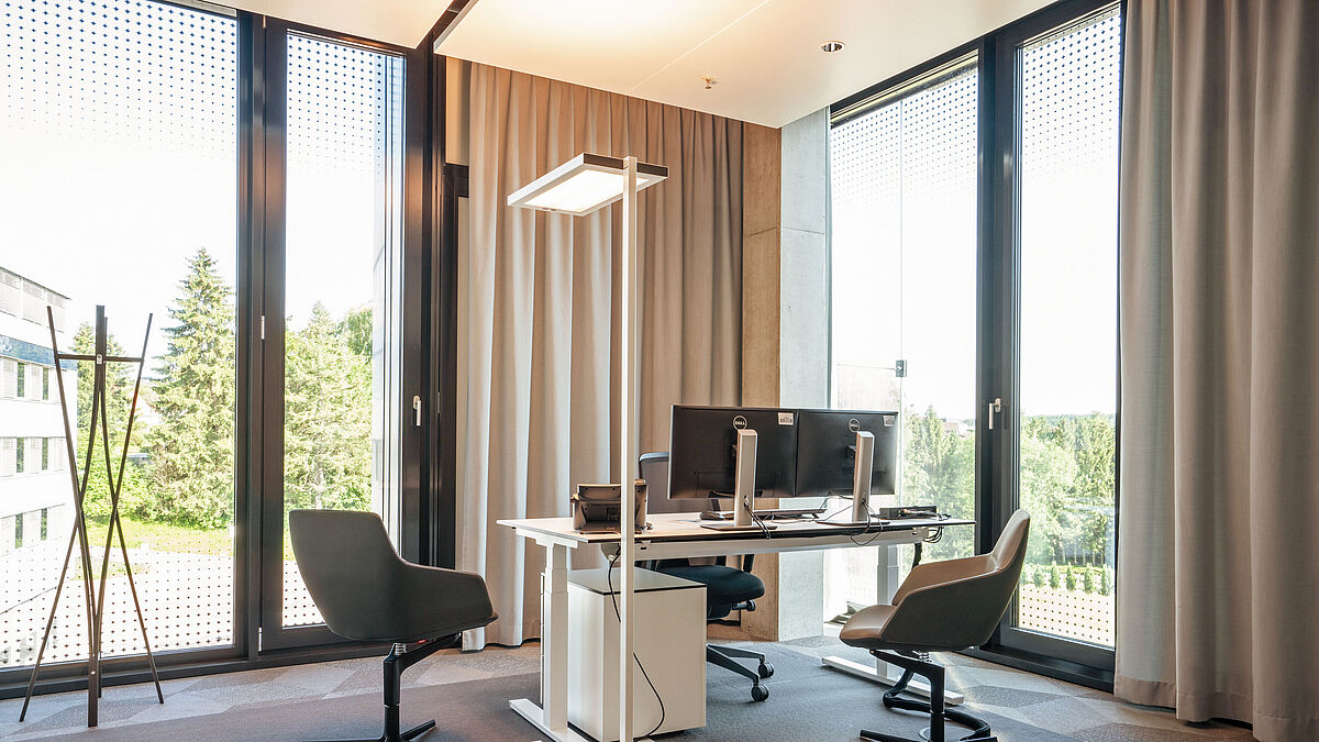 Das GEWE-Therm Sun 3-fach-Isolierglas mit GEWE-Com Connect war schliesslich das Mittel der Wahl: GEWE-Therm-Sun-Sonnenschutzgläser ermöglichen nicht nur einen maximalen Tageslichteintrag, sondern unterbinden auch die Aufheizung der Räume durch starke Sonnenstrahlung. 3-fach-Isolierglas benötigt jedoch zur Erreichung der geforderten Wärmedämmeigenschaften zwei Low-E-Beschichtungen. Diese reflektieren aber nicht nur die Wärmestrahlung, sondern schirmen Hochfrequenzwellen, die zur mobilen Kommunikation notwendig sind, fast vollständig ab.