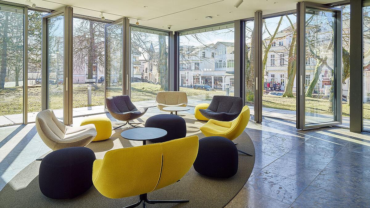 Das sogenannte Lange Haus, zwischen 1874 und 1884 als Verwaltungssitz der Aktiengesellschaft Seebad Heringsdorf errichtet und zuletzt als Bibliothek genutzt, zählt zu den ortsbildprägenden Baudenkmalen des traditionsreichen Seebads auf der Insel Usedom. Über die Jahrzehnte hinweg blieb es weitgehend in seiner ursprünglichen Gestalt erhalten. Ein nachträglich an der Südfassade hinzugefügter Anbau wurde im Rahmen der jüngsten Sanierung abgerissen und durch einen modernen Pavillon aus Stahl und Glas ersetzt. Mit seiner grosszügigen Verglasung signalisiert er Transparenz und Offenheit – aber «offen» ist der Pavillon nicht nur im übertragenen Sinn: Insgesamt acht raumhohe, zweiflügelige Wendetüren mit versetztem Drehlager kennzeichnen diese ganze besondere Fassadenkonstruktion im innovativen Stahlleichtbau.