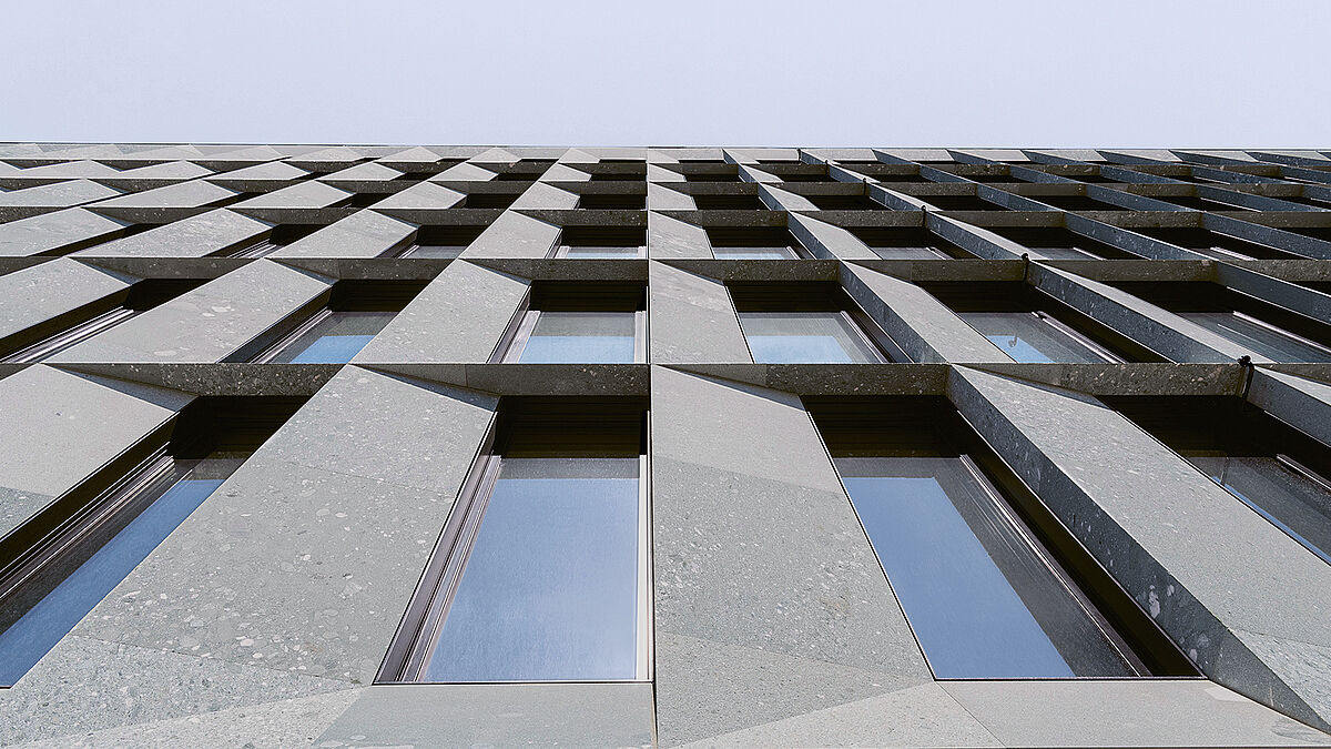 Für die grün schimmernde Fassade wählten die Architekten das grobkörnige Walliser Konglomeratgestein «Vert de Salvan». Dieses verfügt auch über die gewünschte Festigkeit – Voraussetzung für die Umsetzung der scharfkantigen Geometrie der Fassade. Die 3D-Natursteinplatten sind bis zu 40 Millimeter stark. Entsprechend musste das Lastniveau der Verankerungen ausgelegt werden. Eine clevere Verschnitttechnik vereint Sicherheit und Funktionalität mit einer repräsentativen Gebäudeansicht.
