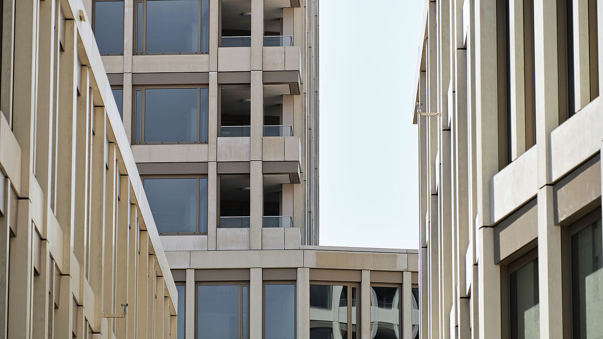 Insgesamt produzierte und montierte Schweizer während rund 16 Monaten 610 Aluminium-Fensterelemente unterschiedlicher Grösse, 109 Hebe/Schiebefenster, 400 Laufmeter Ganzglasgeländer und ca. 2800 Quadratmeter Verbund-Raffstoren. Ergänzt wurden diese Bauteile durch 8000 Quadratmeter Polyesterbeton-Elemente in beigen Farbtönen für die vorgehängte Fassade. Für die Detailabklärungen zur Materialisierung und zum Farbkonzept der Fassade hatte Schweizer übrigens ein rund 5,5 Meter langes und mehr als 6 Meter hohes Mock-up erstellt.
