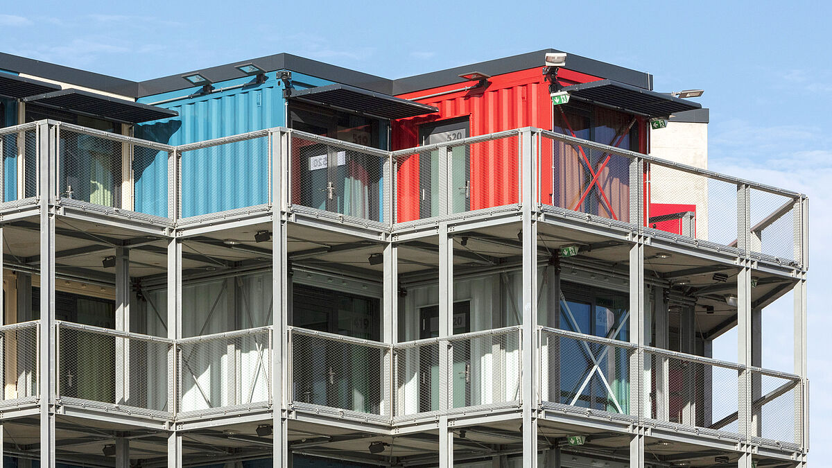 Gegenüber einem leeren 40-Fuss-Container, dessen Innenmasse 12,19 m × 2,44 m × 2,70 m betragen, weisen die Standardzimmer noch eine Länge von 11,72 m und eine Breite von 2,09 m auf. Ihre Raumhöhe von 2,43 m erreichen sie, weil Container vom Typ «High Cube» zum Einsatz kamen, die 30 cm höher sind als der Standardtyp. Damit die Vakuumdämmung unversehrt blieb, war die Befestigung der Einbaumöbel nur an vorab definierten Stellen möglich, was eine detaillierte Planung und Ausführung erforderte. Erst als der Ausbau der Container abgeschlossen war, wurde das Baugerüst entfernt und die Laubengangkonstruktion erstellt.