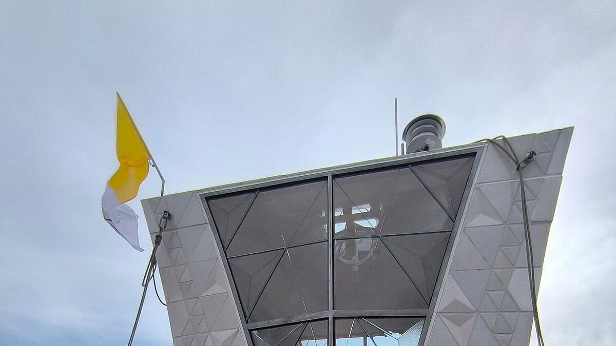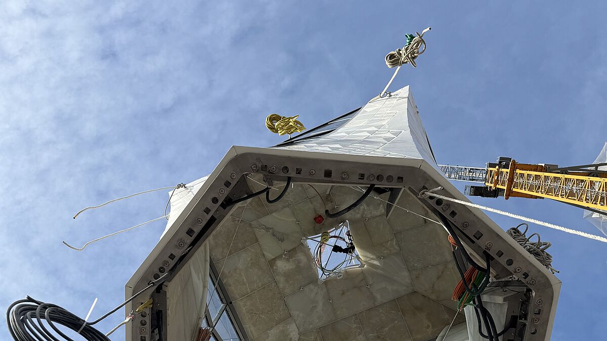 «Heute war es endlich relativ windstill. So konnten wir den oberen Kreuzarm mit einem Hochkran sicher hochziehen und passgenau befestigen. Dabei mussten wir Toleranzen von wenigen Millimetern einhalten. Aber schon im ersten Versuch passten alle Verschraubungen. Als schwäbische Ingenieure und Techniker wollen wir uns ja nichts nachsagen lassen», so Montageleiter Rainer Deininger von der Josef Gartner GmbH, der zusammen mit Gartner-Supervisor Michael Gola und seinem Team das Glaskreuz montiert hat.