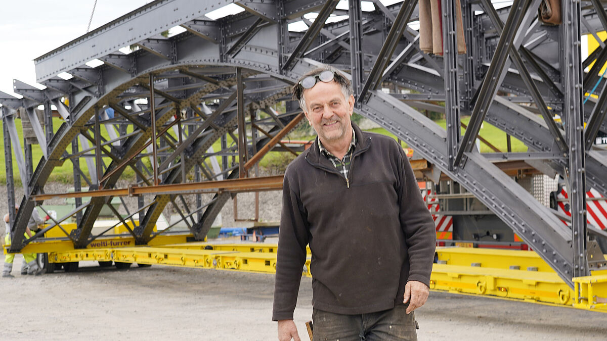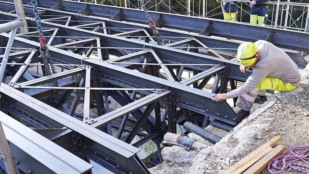 Im Vorfeld der Montage wurden die ebenfalls sanierten Widerlager vor Ort eingesetzt und befestigt. Für den sicheren und deformationsfreien Transport nach Wettingen konstruiertne Moritz Häberling und sein Team eine spezielle Aussteifungskonstruktion, die sich nach der sicheren Platzierung der Brücke einfach entfernen liess. ■