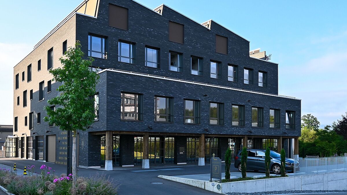 Neben der filigranen Gestaltung überzeugten auch die funktionalen Eigenschaften der eingesetzten Systeme. Im Erdgeschoss kamen Türen mit dem robusten Profilsystem Forster Unico zum Einsatz. Die zu 100 Prozent aus recycelbarem Stahl gefertigten Profile kombinieren hohe Wärmedämmung mit schlanken Ansichtsbreiten. Für die Festverglasungen fiel die Wahl auf das Profilsystem Forster Unico XS, das mit Ansichtsbreiten ab 23 mm besonders filigrane Konstruktionen ermöglicht. Die Schrägfassaden im Attikageschoss und die Verglasungen des Sheddachs realisierte der Metallbau mit dem Vorhangfassadensystem Forster Thermfix Vario Hi. Die 45 mm breiten Stahlprofile bieten Wärmedämmung auf Passivhaus-Niveau (Effizienzklasse phA). Insgesamt wurden über 1000 Glaselemente verbaut – die hohe Tragfähigkeit der Forster-Profile ermöglichte dabei auch grossflächige Verglasungen. Eine tiefmatte Pulverbeschichtung mit Feinstruktur verleiht den Elementen ein hochwertiges, robustes Finish, das zum industriellen Stil passt.